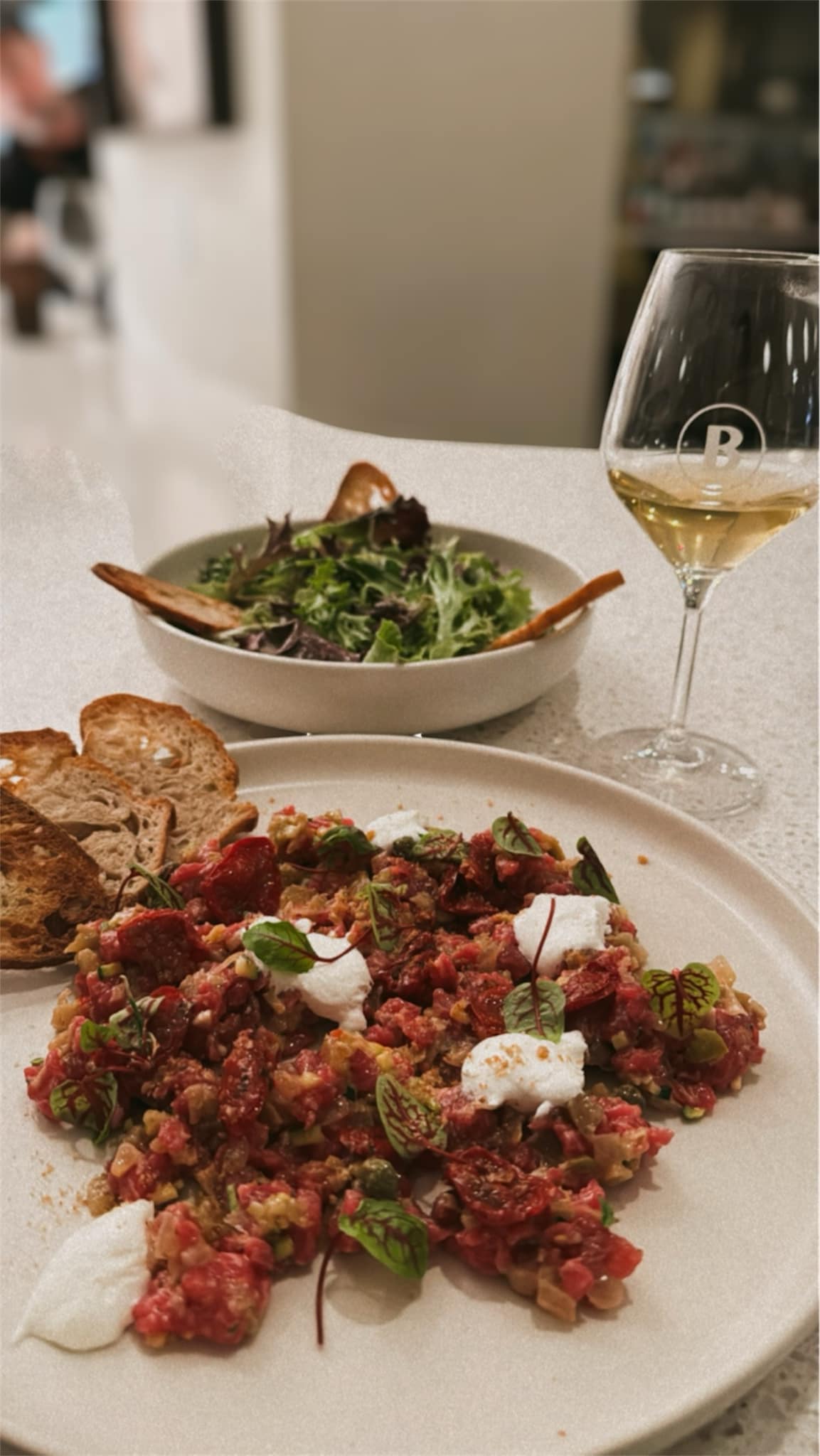 Madame B propose un menu restreint, mais celui-ci change régulièrement et chacun des plats est maitrisé à la perfection. Tomates ancestrales accompagnées de fraises et de mozzarella, onglet de bœuf arrosé d’une sauce au vin rouge, gravlax de saumon servi sur une salade de fenouil…difficile de trancher! Peu importe le repas choisi, c’est une explosion de saveurs garantie! Le modèle d’affaire de Madame B privilégie une cuisine qualitative accessible. Les prix pour les plats du soir varient entre 9$ et 30$. Un menu 5 services à 65$ auquel il est possible d’ajouter 45$ pour un accord met-vin est aussi disponible. Impossible d’être déçu avec l’expertise d’André qui connait ses produits sur le bout des doigts! Au verre ou à la bouteille, le client a accès à plusieurs choix de vins locaux ou d’importation privée (tous biologiques!). Une carte de cocktails créée par la mixologue Hope Guimond propose une variété de boissons créatives et colorées. Finalement, ce serait un crime de partir sans avoir gouté la croustade aux prunes et ricotta! Quel délice!